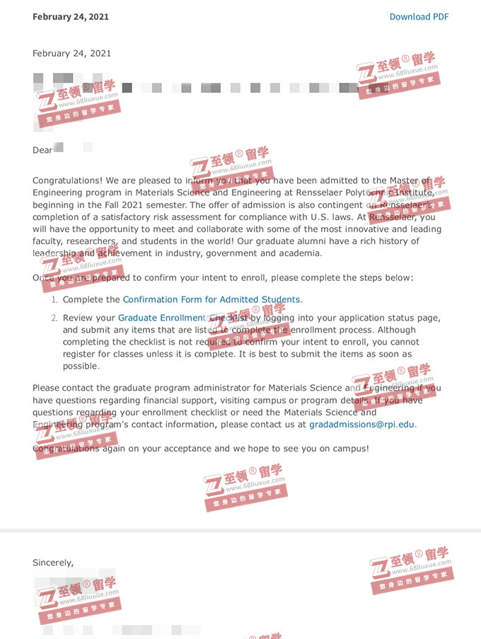 录取结果:RPI,Master of Engineering program in Materials Science and Engineering伦斯勒理工学院材料工程硕士录取