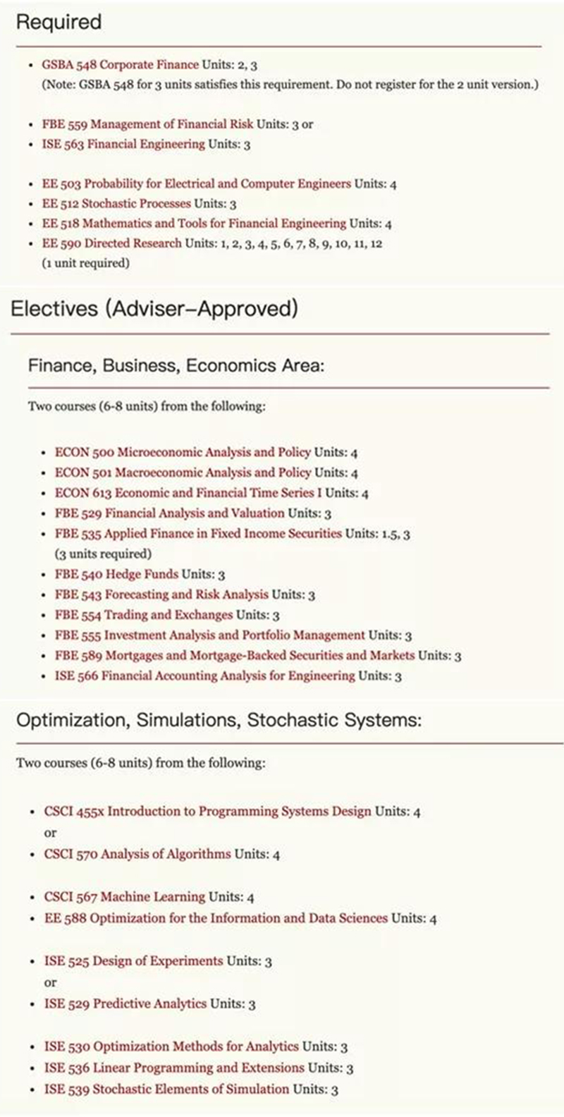 金融工程开设在USC有名的Viterbi工学院下,由商学院和文理学院的经济系共同参与,项目时长1.5年,金融工程主要是使用金融和经济学,工程学,应用数学和统计学等工具来解决诸如衍生证券估值,战略规划和动态投资策略,风险管理等问题。具有这些技能的毕业生就业偏向于投资银行和商业银行,贸易公司,对冲基金,保险公司,企业风险管理人员和监管机构等。