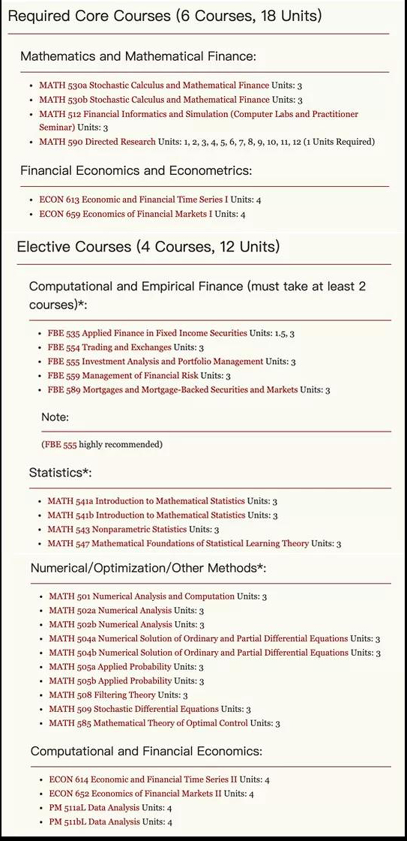 金融数学:金数项目需要完成30个学分,6门核心课,4-5门选修课