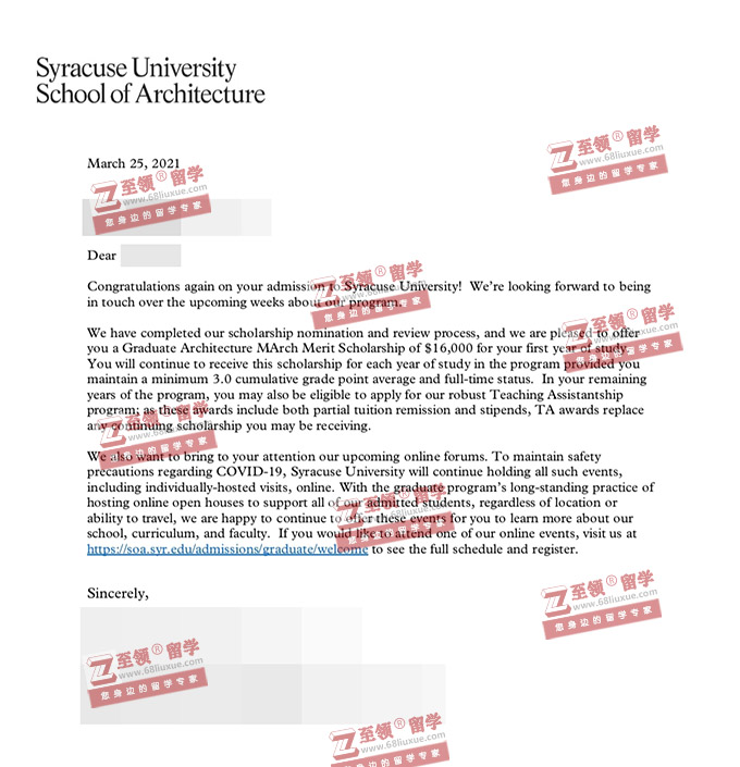 录取结果:Syracuse University,Master of Architecture雪城大学建筑学硕士录取+$16,000