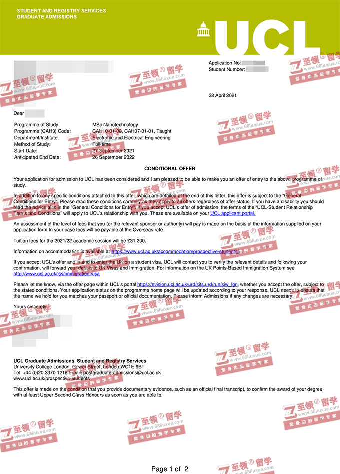录取结果:UCL,MSc Nanotechnology 伦敦大学学院纳米技术硕士录取