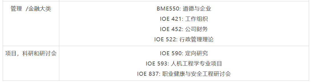 Ergonomics,OSE)这一方向的学生可以从职业健康与安全,人体工学,认知人机工程学(人因工程),工程大类,管理和科研6个模块中选择感兴趣的课程学生可以根据校方提供的课程清单,选择自己感兴趣的内容来满足课程模块要求。