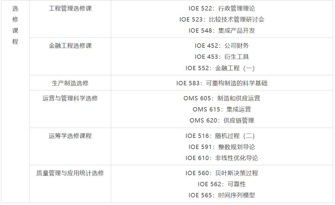 目前IOE的运筹学硕士项目为学生提供包括人机工程,生产物流,质量工程,金融工程在内的7个发展方向。学生需要任选其感兴趣的一个方向进行学习。每个方向的培养内容,课设置和毕业要求都不尽相同,因此有申请意向的同学一定要在申请前自行查看,确定培养方案与自身需求是否匹配。