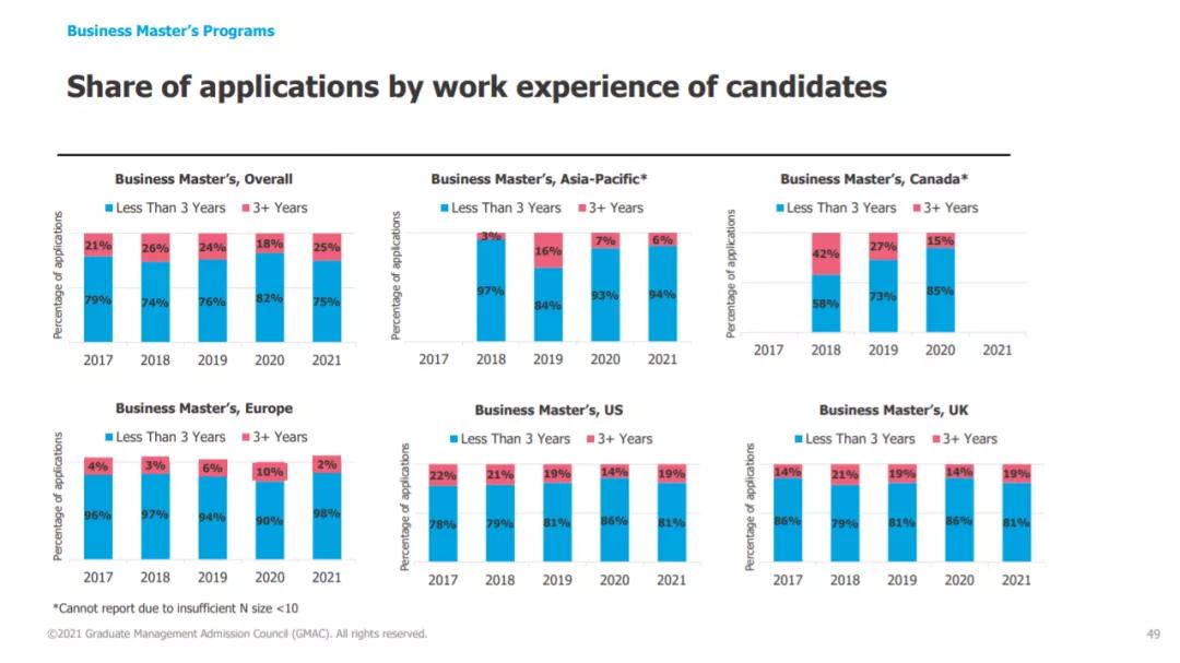2021年,75%的商科硕士项目申请人工作经验少于3年,有3年以上工作经验的申请人在英国和美国的占比更高。