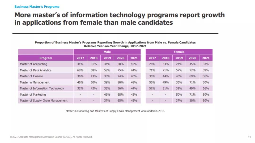 更多信息技术硕士项目表示女性申请人有所增加,可见女性对于技术性强的工作越来越感兴趣。