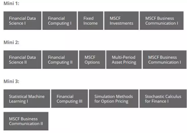 MSCF项目长度为15个月(3个学期),并遵循Tepper商学院的小学期制度,所以项目其实是由6个小学期构成,这也使得学生可以接触更广的课程。