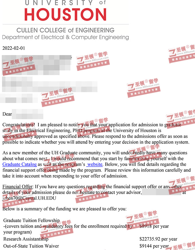 录取结果:University of Houston,PhD in Electrical Engineering 休斯敦大学电气工程博士录取,奖学金$40797.92/年