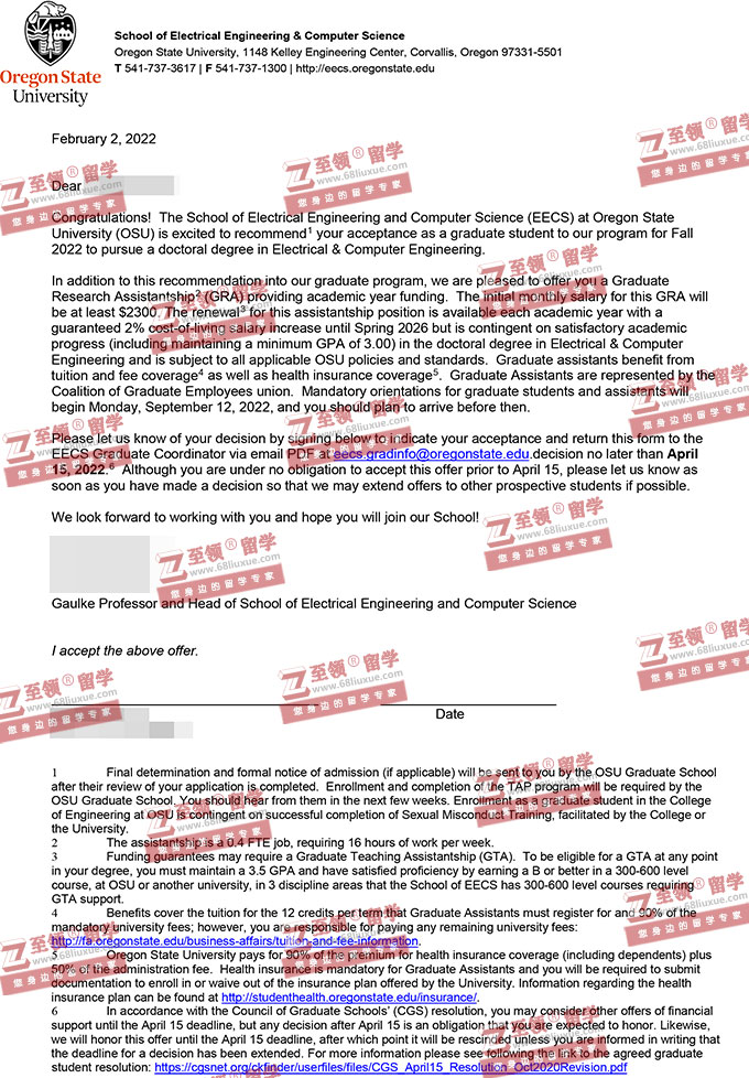 录取结果:Oregon State University,PhD in Electrical & Computer Engineering 俄勒冈州立大学电子与计算机工程博士录取,奖学金$59750.71/年