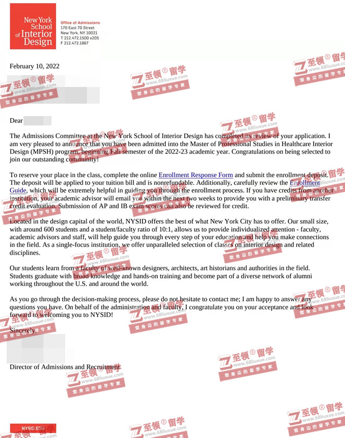 录取结果:New York School of Interior Design,Master of Professional Studies in Healthcare Interior Design纽约室内设计学院室内设计硕士