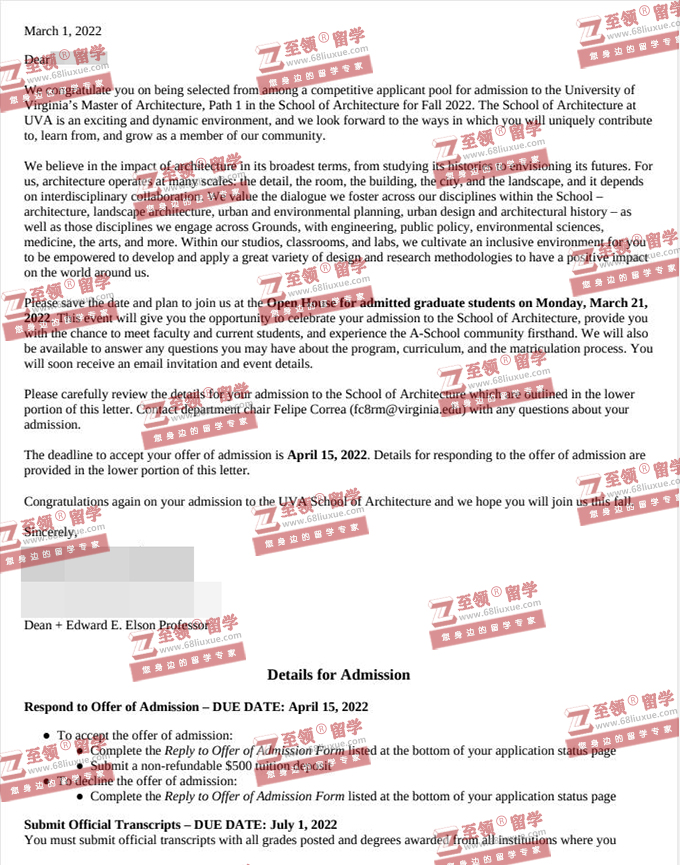录取结果:University of Virginia,Master of Architecture PATH 1 弗吉尼亚大学建筑学硕士录取