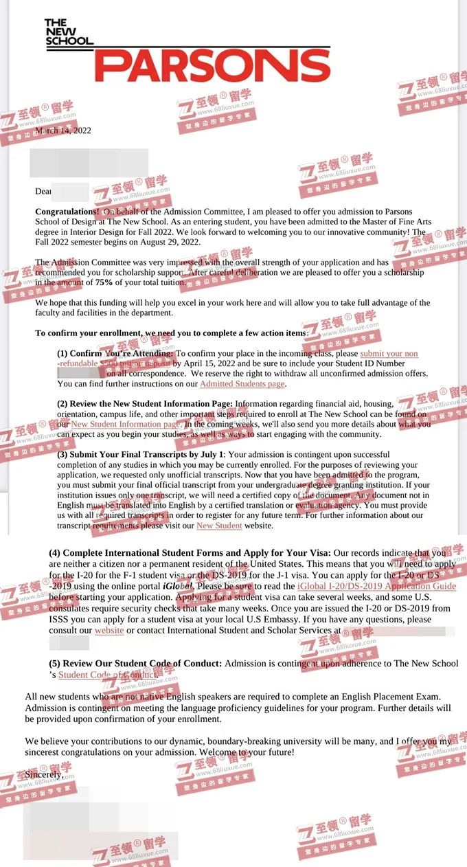 录取结果:Parsons the New School for DesignInterior Design(Master of Fine Arts)帕森斯设计学院室内设计(美术硕士)录取+奖学金:75%学费减免
