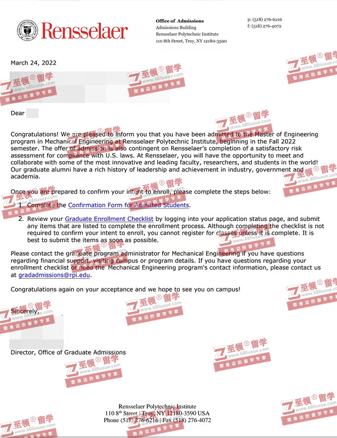 录取结果:Rensselaer Polytechnic Institute,Master of Engineering in Mechanical Engineering 伦斯勒理工学院机械工程硕士录取