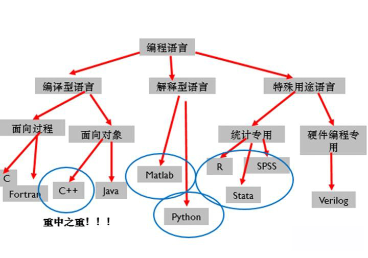 量化金融类硕士(金融工程,金融数学,计算金融等)对计算机能力的要求,也即是对申请者编程能力的要求。首先,一个好的金融工程师,必须做到精通C++,其入门难度为各语言之首,所以申请者必须尽早学习和准备。下图给大家详细列明了编程语言的大概分类,我认为蓝圈部分是对于美国量化金融硕士申请者来说最为重要的,也是结合这么多年量化金融类成功录取者编程能力背景所归纳的,请同学们重点注意。