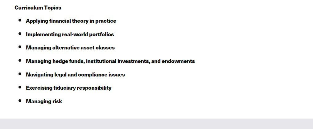 该项目的一个亮点是资产管理研讨会(Colloquium in Asset Management),该座谈会邀请了顶级高管、投资者和从业者来校园就该行业进行坦诚的讨论。除了课程之外,学生还需要完成一项至少40小时的实践活动,即在参与一个资产管理相关的企业实习或真实的企业项目,协助SOM管理学院的金融教授进行与资产管理相关的研究,或其它系主任批准的替代活动。