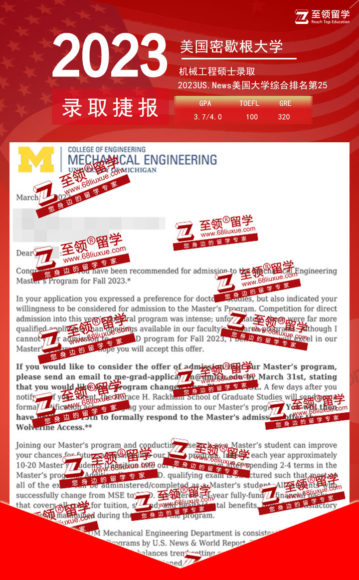 录取结果:University of Michigan,Master in Mechanical Engineering 密歇根大学机械工程硕士录取