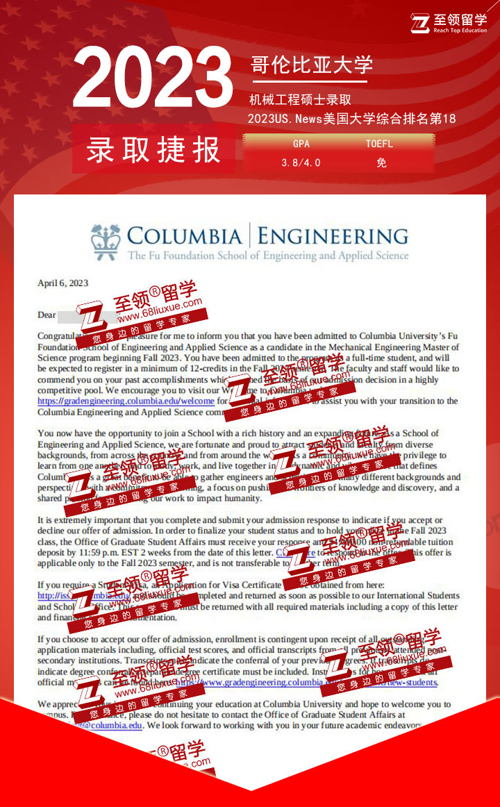 录取结果:Columbia University,Master of Science in Mechanical Engineering 哥伦比亚大学机械工程硕士录取