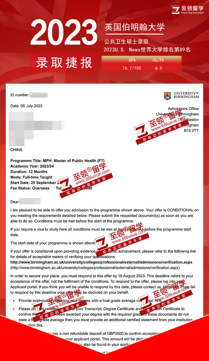 录取结果:University Of Birmingham ,MPH 伯明翰大学公共卫生硕士录取