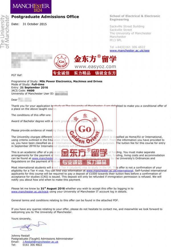 文书材料一切准备得当后,网申顾问于9月份提交了申请,在10月底的时候,收到了英国曼彻斯特大学电力电子机械和动力学硕士的录取OFFER。这一刻,金东方留学团队的老师们都为A同学感到兴奋,几个月的努力总算是有了一个圆满的结局。