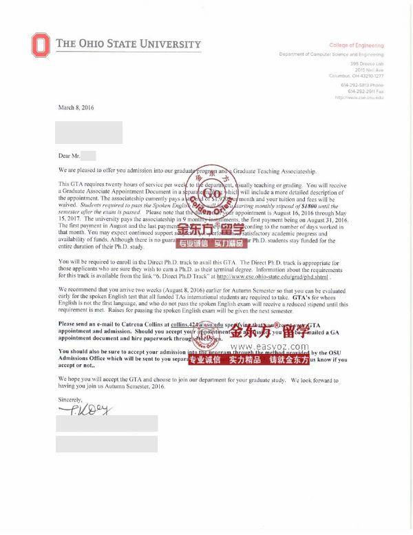 谢同学本科就读于国内名校,硕士就读于国外大学,能获得俄亥俄州立大学计算机工程博士免学费带奖学金录取,这对谢同学和其家长,以及金东方留学服务团队的老师来讲都是一次成功的体验。