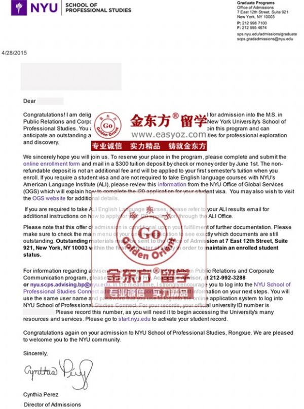在漫长的等待中,R同学终不负众望,终于在4月28日拿到了纽约大学公共关系与企业传媒专业的录取。