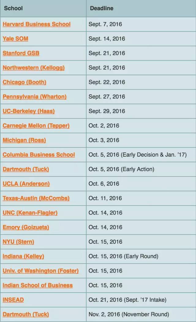 比如,哈佛大学商学院的的第一轮申请截止日期被提前了两天,变成了9月7日;斯坦福大学的研究生商学院申请截止被提前到了9月21日;耶鲁大学商学院MBA的第一轮申请截止日期也提早了两天,变到了9月14日。下面是部分院校的申请截止日期汇总情况: