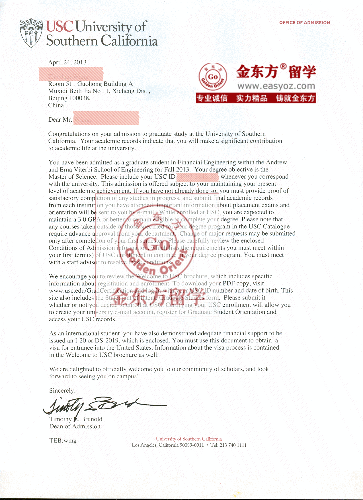 ZHW同学的硬指标很容易被淹没在一堆申请人中,GPA只有3.2,托福勉强考够102分,GRE更是只有317。就是这样的硬指标,却非常幸运的获得了南加大金融工程硕士的录取,USC Master of Financial Engineering,下面请看申请详细过程。