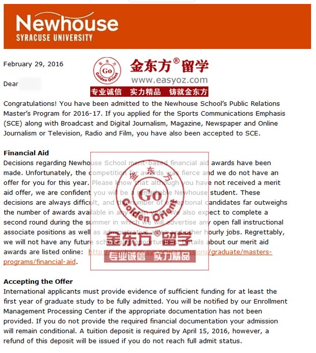 录取结果:雪城大学公共关系专业
