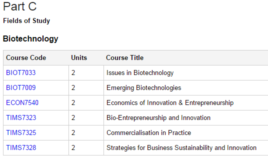 昆士兰大学技术与创新管理硕士(Master of Technology and Innovation Management)学制为1.5年,学生共需修完24个学分(unit)的课程。其中,8个学分为必修课(Part A);12个学分,学生需要从选修课(Part B),或者,细分专业课(Part C)中选择;另外4个学分,学生可从Part B和Part D中选择。