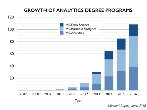 为了培养数据分析方面的人才,近几年来美国的高等学府都争相开设数据科学Data Science、数据分析Data Analytics、商业分析Business Analytics等相关课程,下图的统计很好的说明了这趋势。