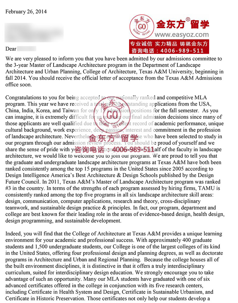 录取结果:德州农工大学,景观建筑硕士(Master of Landscape Architecture,缩写:MLA)