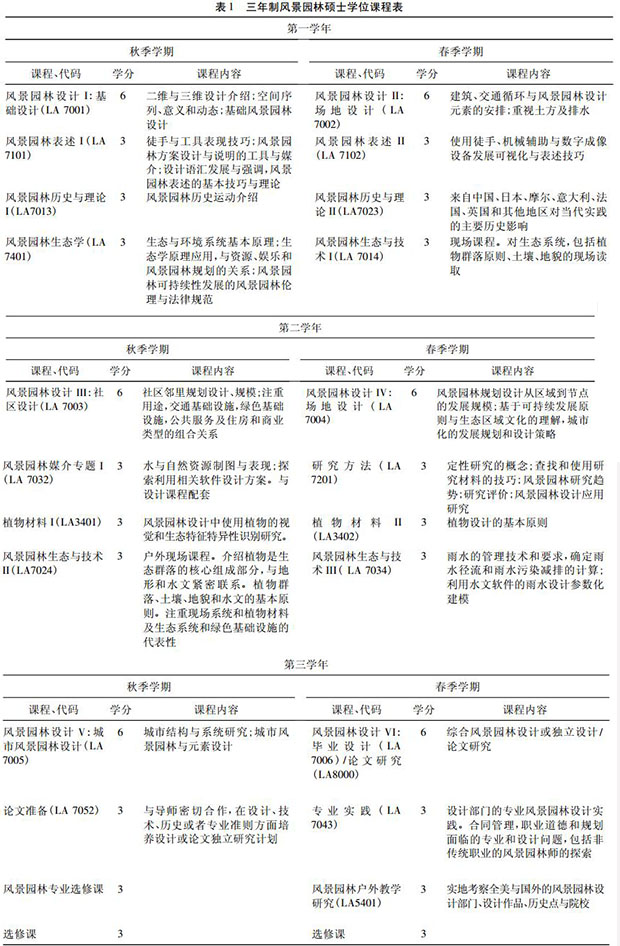 LSU 景观设计硕士课程设置完善,提供给学生充足的设计参与机会,得到学科内的广泛公认。一般包括专业设计课、生态技术与工程课、设计基础与表达课、设计理论课、设计实习等( 表 1) 。