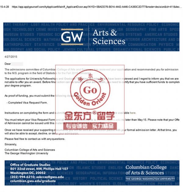 在经历了诸多的困难之后,宁同学的申请终于告一段落,接下来就是漫长的等待。皇天不付有心人哪,宁同学终被乔治华盛顿大学统计学硕士录取。回想他的留学申请过程,真是充满了太多的变数,不过凭借多年的工作经验,我们都能及时帮助他解决,再多的变数也都是申请路上的一个小插曲,并不会阻挡学生的申请之路,因为有金东方留学团队的保驾护航,学生们都能走进心仪的学校!