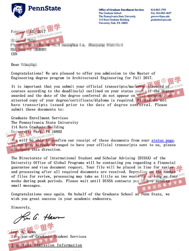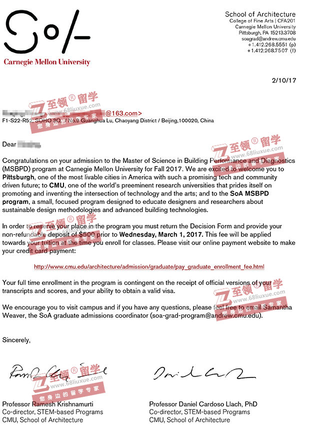 Carnegie Mellon University (卡内基梅隆大学), Master of Science in Building Performance and Diagnostics建筑性能与诊断学理学硕士;Pennsylvania State University-University Park(宾州州立大学公园分校),Master of Engineering in Architectural Engineering(建筑工程硕士)录取