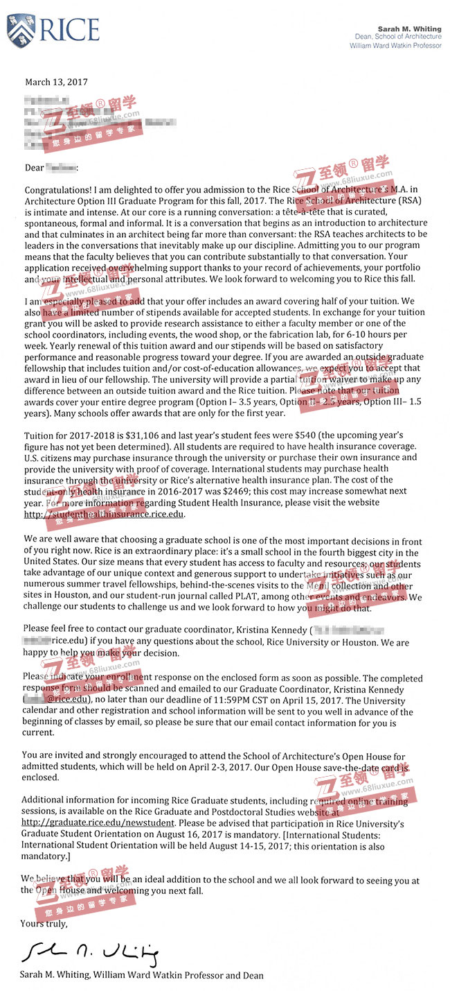 录取结果:莱斯大学,Master of Architecture Option III (1.5年),奖学金$23000