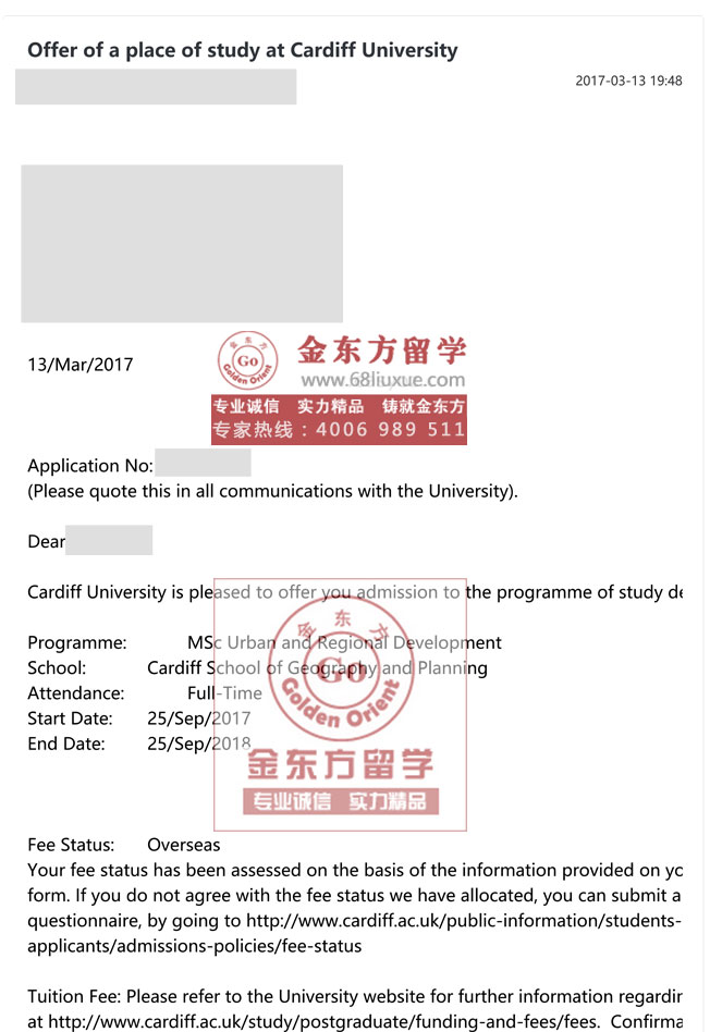 录取结果:Cardiff University卡迪夫大学, MSc Urban and Regional Development Conditional城市规划硕士