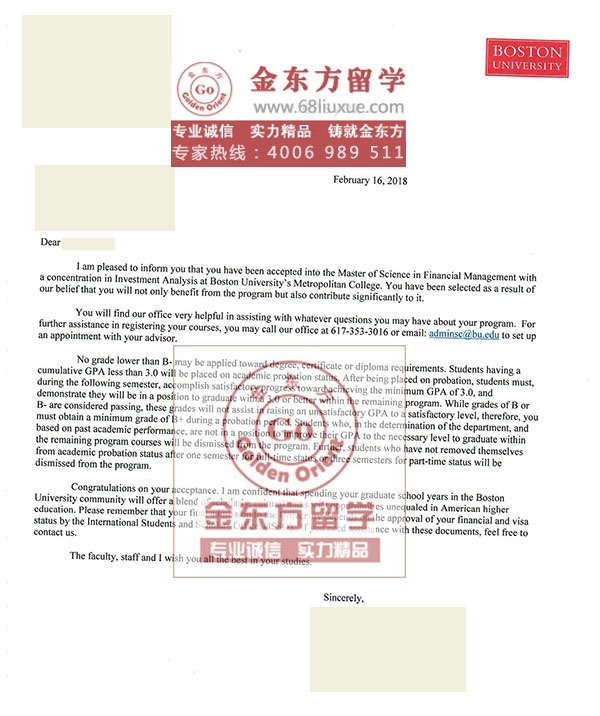 录取结果:Boston University波士顿大学,Masters of Science in Financial Management with conceration in Investment Analysis 金融硕士