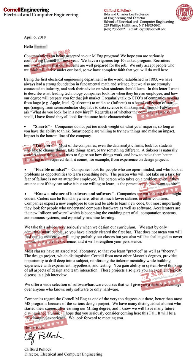 经过团队老师们和学生的积极配合,金同学拿到了美国著名的常春藤联盟成员康奈尔大学电子工程硕士OFFER。