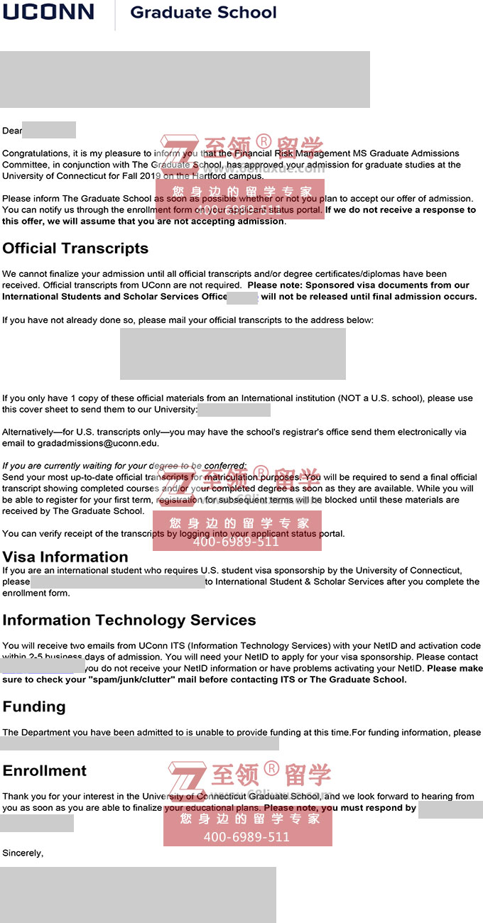 录取结果:University of Connecticut康涅狄格大学,Master of Science in Financial Risk Management 金融风险管理硕士