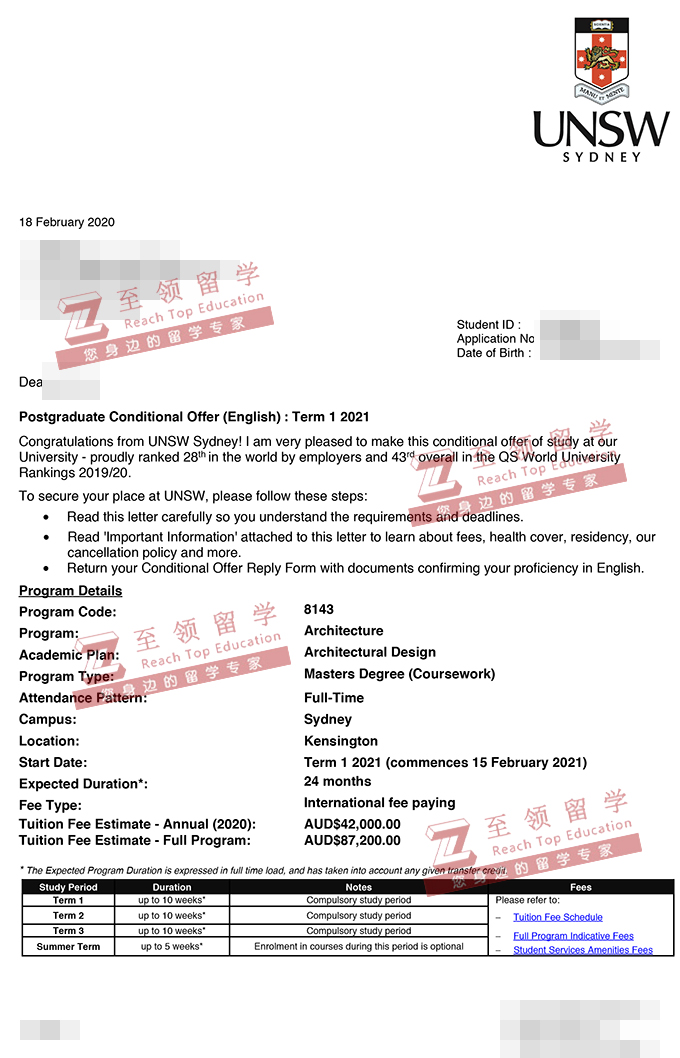录取结果:The University of New South Wales,Master of Architecture新南威尔士大学建筑学硕士录取