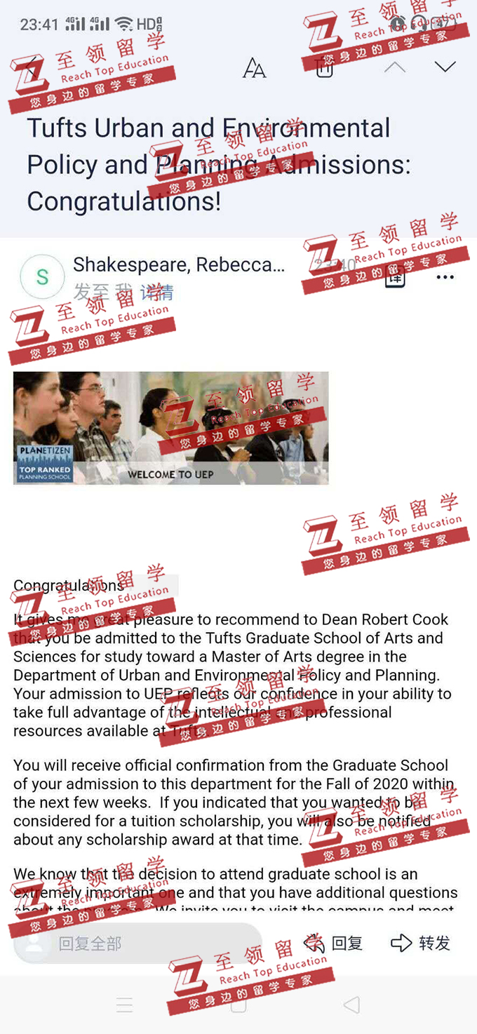 录取结果:Tufts University,MA in Urban and Environmental Policy and Planning塔夫茨大学城市与环境规划硕士录取