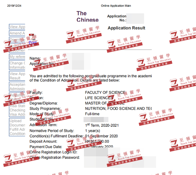 录取结果:CUHK, MSc in Nutrition, Food Science and Technology香港中文大学食品营养硕士录取
