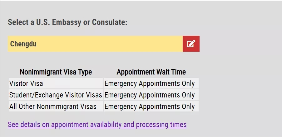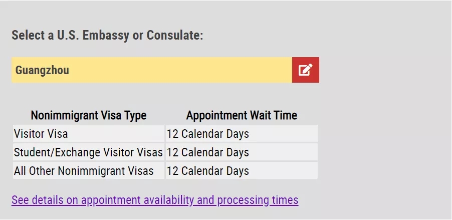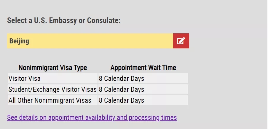 美国国务院领事事务局(U.S. Department of State)官网:https://travel.state.gov/content/travel/en/us-visas/visa-information-resources/wait-times.html