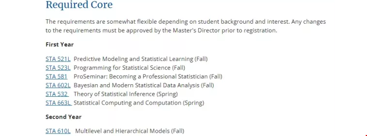 课程设置:杜克大学统计学硕士课程包含必修课程和选修课程: