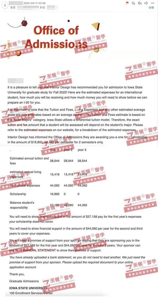 录取结果:Iowa State University,MA in Interior Design 爱荷华州立大学室内设计硕士录取 +$16892