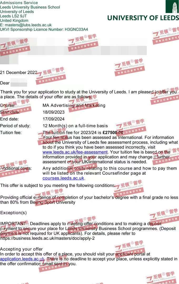 恭喜至领留学学子R同学转专业申请,斩获利兹大学(University of Leeds)广告与营销硕士(Advertising and Marketing)硕士录取!