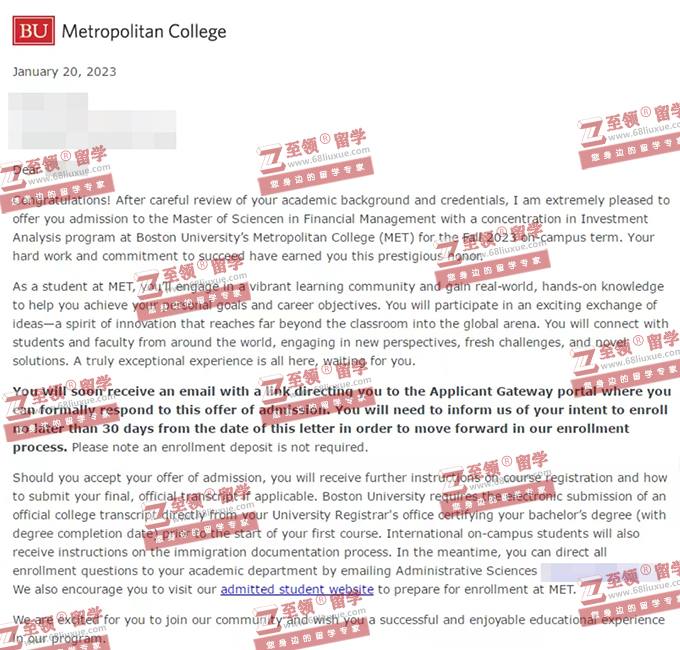 录取结果:波士顿大学(Boston University),金融管理录取(Master of Sciencen in Financial Management)