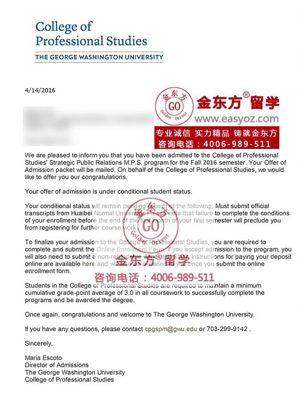 坦白说,我一直有名校情结,在根据自己的背景来看,我对自己的申请没抱有太高的期望,直到加入后,我的咨询师针对我的背景为我分析了目前的优劣势,并根据我的实际情况为我制定了背景提升方案,使我的背景逐渐的丰富,才换来了令我满意的结果。另外在申请时我也经常问我的咨询老师,她每次都能很耐心的为我解答,安抚并鼓励我坚持走下去,如果没有她的陪伴和鼓励,我想我可能不会顺利的完成申请,也有可能会多走很多弯路。所以我特别感谢各位老师对我申请中的各种帮助。当拿到George Washington University这所学校的OFFER时,我欣喜若狂。