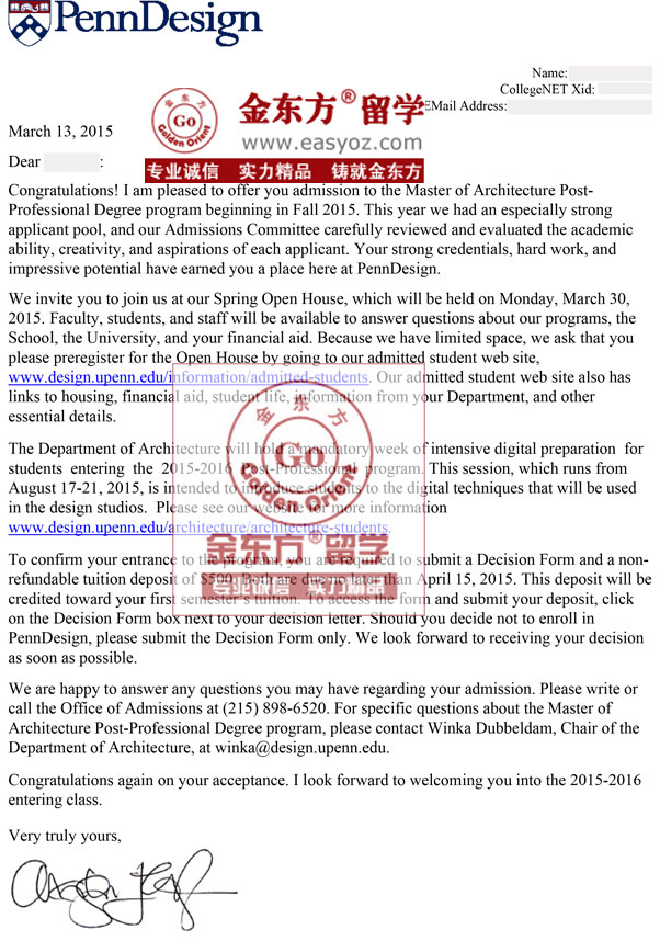 3.14日一大早晨打开邮箱,很惊喜的收到九位同学的宾大录取offer!金东方客户所有建筑学客户同时被宾大这种超牛学校建筑学录取是相当令人震撼的,也是我们没有想到过的结果。宾大建筑系还是中国建筑系教育的始祖!