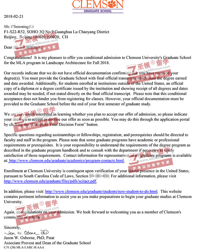 录取结果:Clemson University克莱姆森大学,MS in Landscape Architecture景观建筑设计硕士