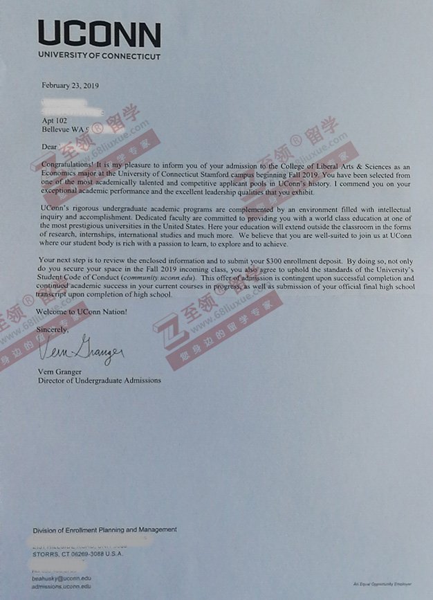 录取结果:University of Connecticut康涅狄格大学, BSc in Business Administration 工商管理本科